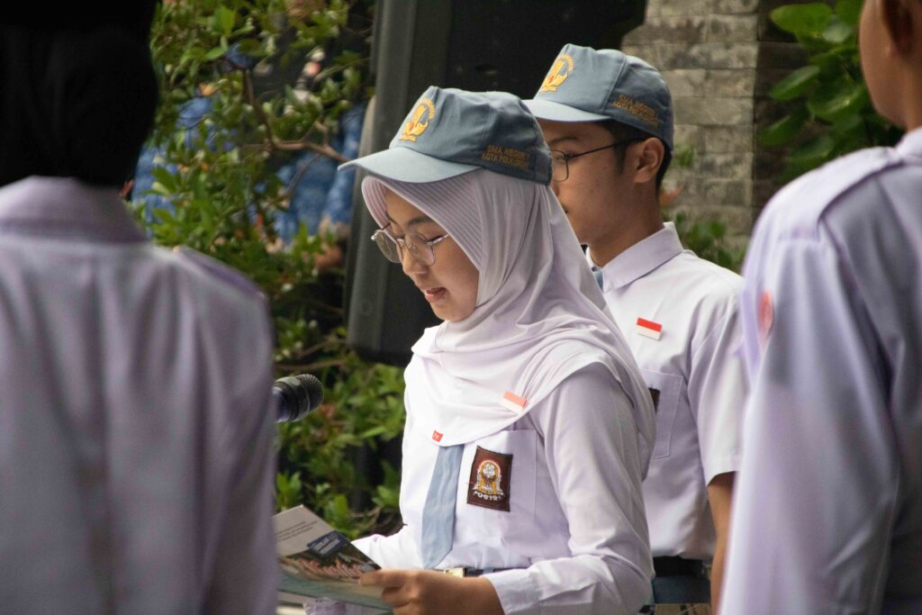 Di tengah barisan yang rapi, dua siswa tampil membacakan pesan-pesan inspiratif dari para pahlawan nasional. Ricky Adva Albaihaqy dari kelas XI Kartini 1 dan Quinsha Tsabitha Azka dari kelas X Kartini 6 menyuarakan kutipan perjuangan tokoh-tokoh seperti Tjut Nyak Dien dan Kapitan Pattimura. Tepat pukul 07.32 WIB, suara mereka menggema, mengingatkan semua yang hadir tentang arti pengorbanan dan keberanian.